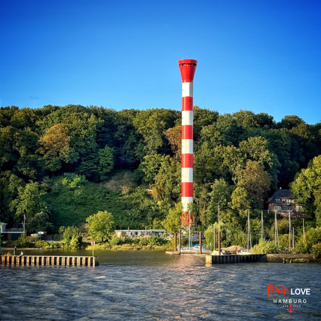 Durch den Park gehend kommst du an einen Aussichtsplattform mit Bänken. Von hier aus siehst du den zweiten Blankneser Leuchtturm (Oberfeuer) und die Finkenwerder Krähne.